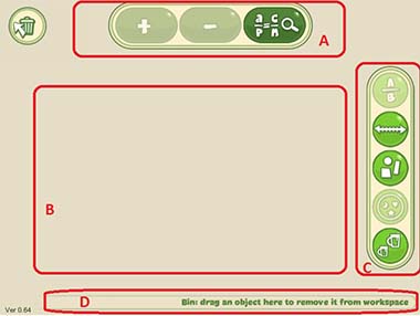 At the bottom [D] of the display area, hints, tips and feedback are presented to users. At this stage of development, different functionalities are available: